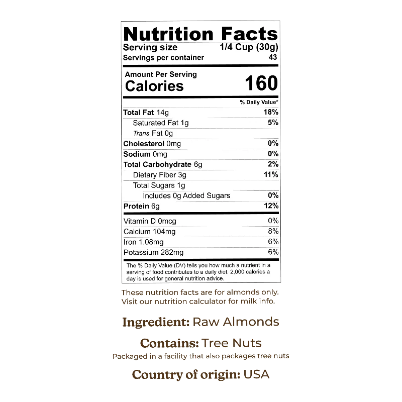 High quality almonds for milking, cooking, or snacking. Our raw almonds are the ideal size to produce silky smooth almond milk, every time.Â